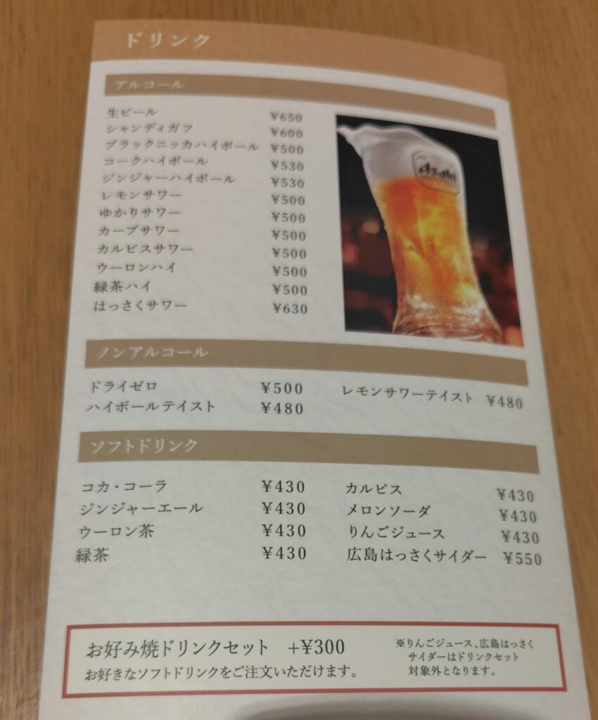 サイドメニューも頼みたいところですが、みっちゃん総本店のお好み焼きはかなりボリューミーだった記憶があるので、いったんお好み焼き単品で注文。
