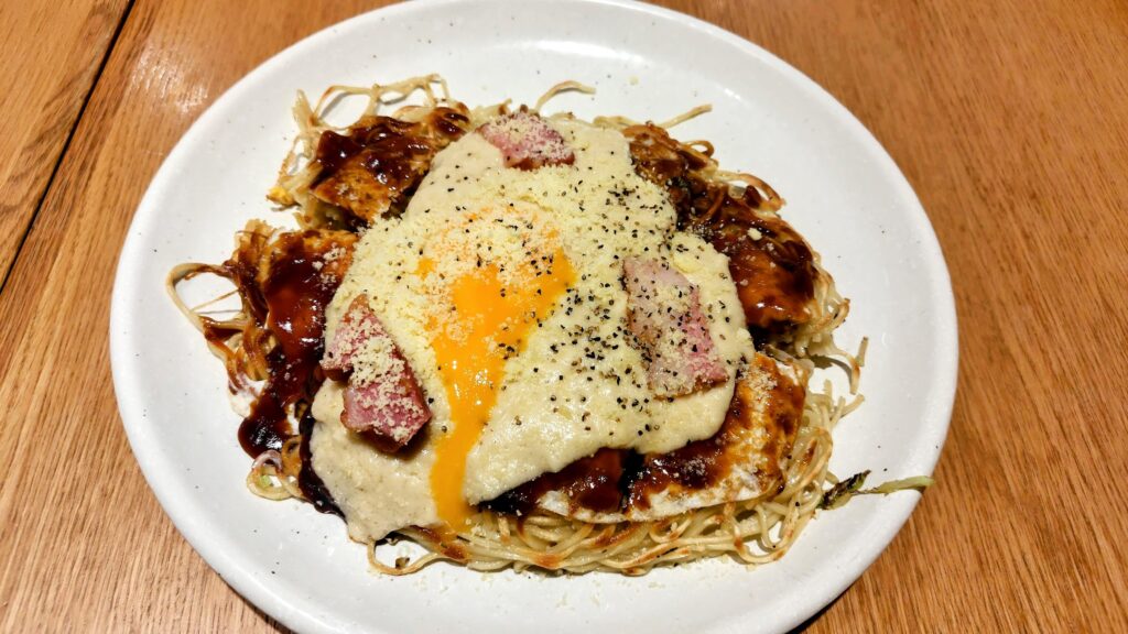 カルボナーラとソースって合うのかな?と思っていましたがこれが不思議とよく合う!卵の濃厚さも相まってたまらないおいしさです。
