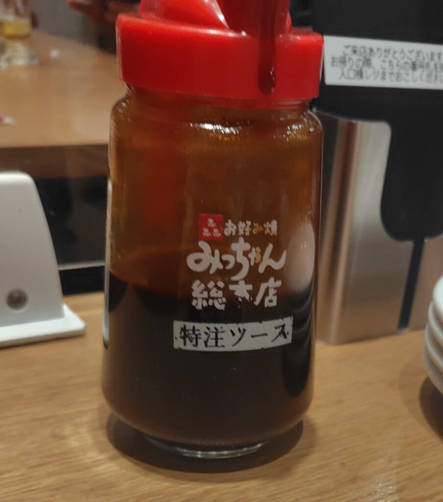 ソースは最初からたっぷりかかっていますが、卓上にも置いてあるので、自由にかけられます。このソースがお好み焼きによく合う甘めの味で、さすが特注。