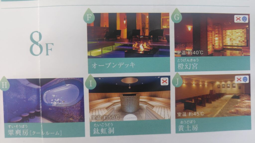 素材や室温の異なる各種岩盤浴、クールルーム、休憩スペース、オープンデッキなどがあり、まるで南国リゾートのような非日常空間が広がっています。