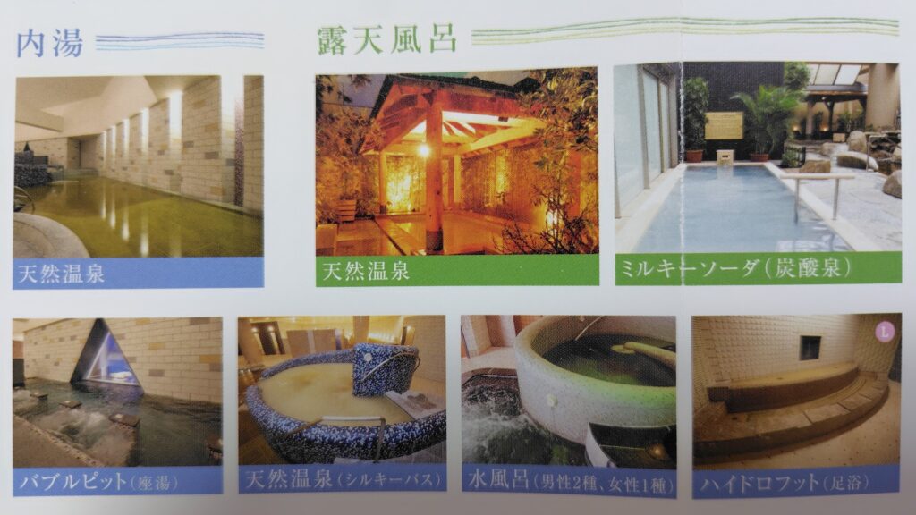 スパラクーアの温泉は、地下1,700メートルから湧き出る天然温泉を使用。少しとろみのあるお湯で、肌がすべすべになります。種類もたくさんあるので、時間を忘れて長湯してしまいます。