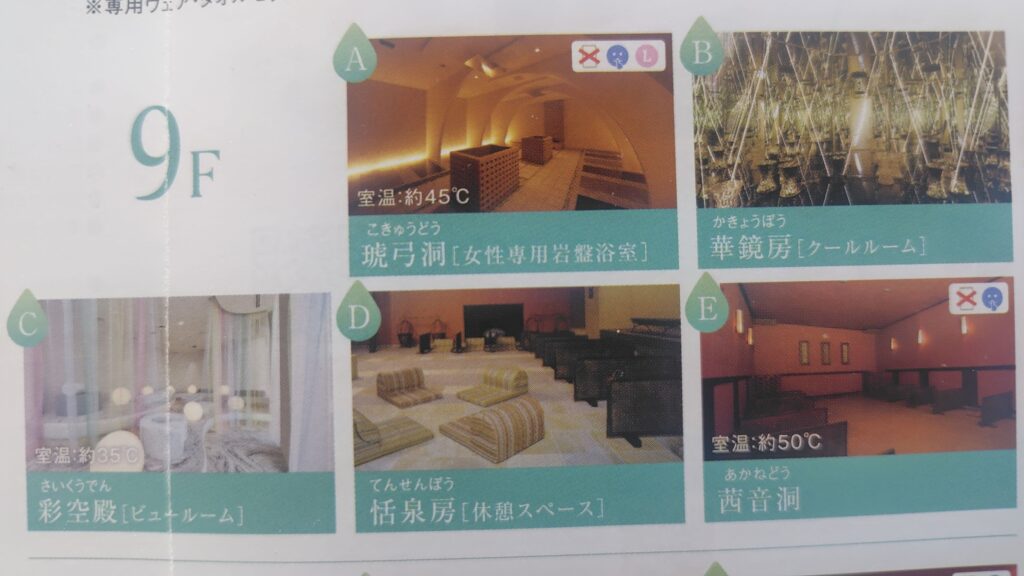 18歳未満は利用できないヒーリングバーデ(岩盤浴・休憩スペース)の利用には岩盤浴専用ウエア・タオルのレンタル料として1,100円かかります。